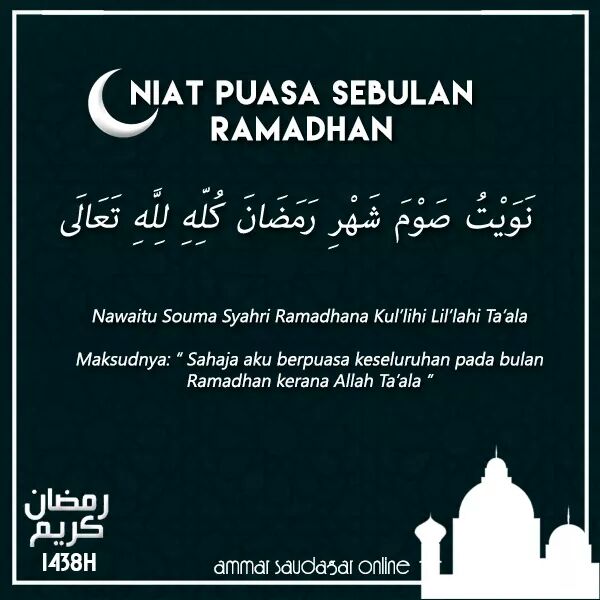 Niat puasa ramadhan sebulan in english. 79 Imam Nawawi al-Bantani dalam kitab Kaasyifatus Sajaa niat puasa Ramadhan harus dilakukan setiap malam karena puasa dalam tiap-tiap harinya. JAKARTA - Niat Puasa Ramadhan menjadi sangat penting diperhatian sebelum masuk waktu berpuasa. Ini karena puasa setiap hari di bulan Ramadhan masing-masing hari berdiri sendiriJadi tidak berkaitan satu dan lainnya dan tidak pula puasa di satu hari merusak puasa hari lainnya.